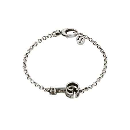 Raffinato bracciale Gucci in argento 925 con chiave a forma di Doppia G e finitura anticata, misura 17 cm. Design elaborato che combina richiami classici e contemporanei.