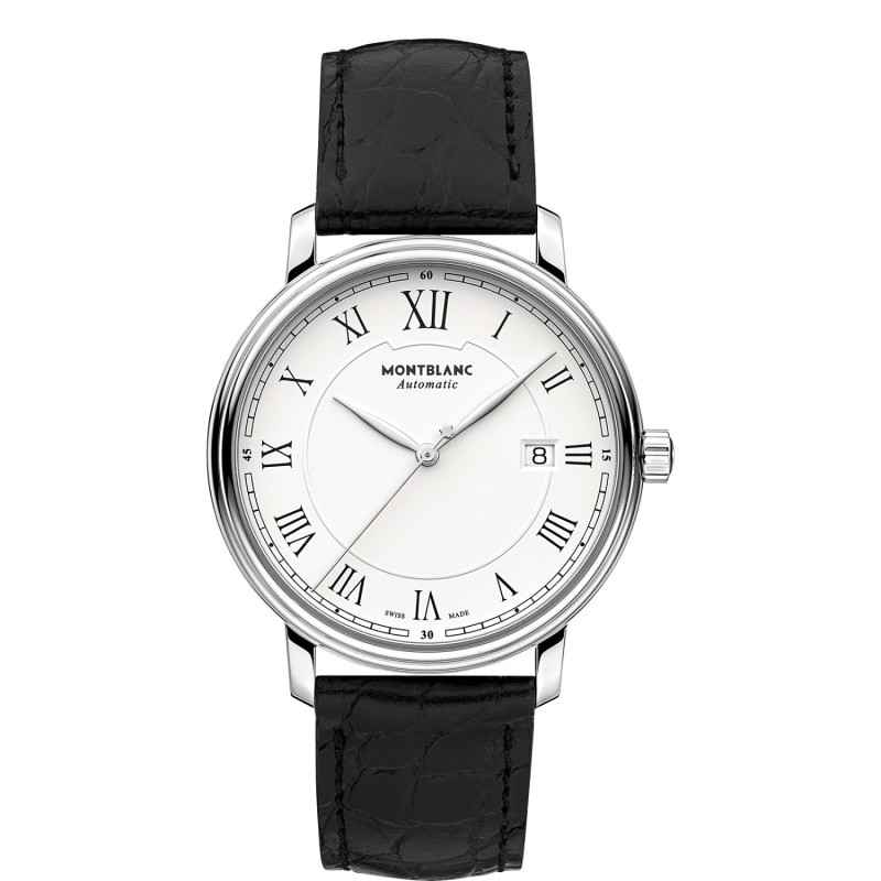 Montblanc Tradition Date 112609: eleganza senza tempo con quadrante bianco, numeri romani e movimento automatico. Cinturino in pelle nera per comfort e classe.