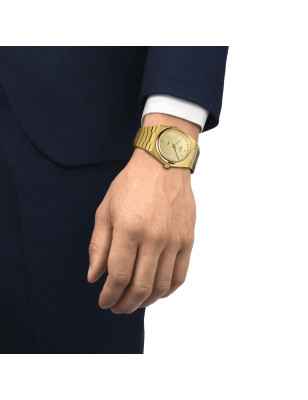 Nel 1978, Tissot creò un modello al quarzo caratterizzato da una cassa sottile, indici stretti e un bracciale in acciaio, con un'ampia ansa orizzontale perfettamente integrata nella cassa piatta a forma di tonneau. Pochi anni dopo, Tissot registrò il nome PRX: "PR" sta per "preciso" e "robusto", mentre la "X" rappresenta il numero romano dieci e la pressione di 10 bar che l'orologio è in grado di sopportare. Nel 2021, Tissot ha presentato il PRX 40205, una versione moderna del modello precedente. Con una cassa in acciaio inossidabile 316L con trattamento PVD oro e un quadrante champagne, questo orologio cattura l'essenza del design originale del 1978. Il movimento al quarzo Swiss-Made ETA F06.115 garantisce precisione e affidabilità, mentre il vetro zaffiro antigraffio e il cinturino intercambiabile a sgancio rapido offrono durata e versatilità. Perfetto per gli amanti del design retrò.