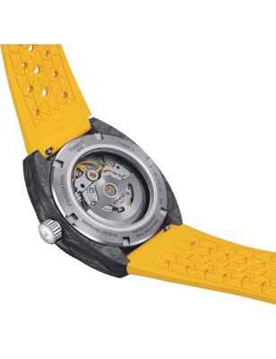 Scopri il Tissot Sideral: unione di fascino vintage e artigianato moderno, con cassa in carbonio, quadrante multicolore e cinturino giallo vivace.