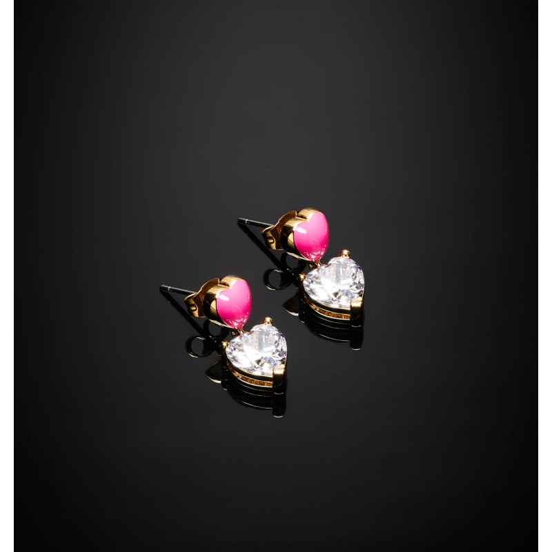 Orecchini con cuoricino fucsia e zircone, realizzati in rodio placcato oro 18K con dettagli smaltati.