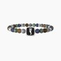 Bracciale elastico con pietre alternate multicolore e anelli in acciaio. Elemento quadrato con cornetto portafortuna sul fronte e scritte Porte Bonheur sul retro. Un gioiello di buon augurio da regalare o regalarsi.