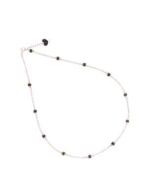 Girocollo realizzato in argento 925 con galvanica oro rosa ad alto spessore e resistenza. Presenta una cascata di catene aventi alle estremità pietre di Spinelli.