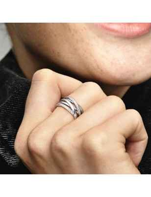 Linee scintillanti e lucide si alternano in questo anello che darà luce alla tua personalità. Realizzato in Argento Sterling 925, questo anello dal design sofisticato e contemporaneo presenta splendide linee intrecciate di metallo lucido e pietre di zirconia cubica scintillante. Un modello che non passa inosservato: indossalo da solo come raffinato anello da cocktail o con altri anelli Pandora.