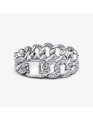 Questo anello catena maglia cubana pavè in Argento Sterling 925 illumina ogni look, con 84 pietre di zirconia cubica incolore taglio brillante rotondo incastonate a granette. L'anello presenta un motivo a catena, in cui ciascun anello a semicerchio è decorato da tre pietre rotonde, mentre il retro è lucido per garantire un uso confortevole.