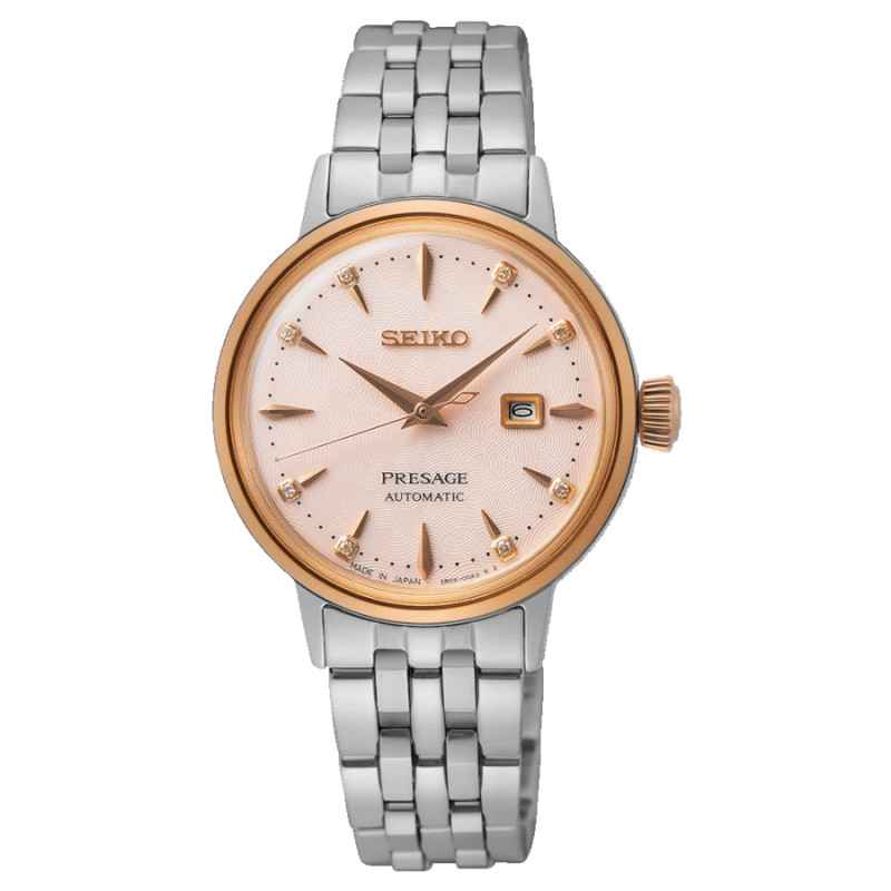 Il nuovo Presage Cocktail SRE010J1 si ispira al cocktail Pink Lady. Il quadrante, gli indici e le lancette in oro sono scintillanti. Il quadrante è fine e delicato, con una finitura meticolosa. Sul quadrante vengono applicati diversi strati di rivestimento trasparente prima di essere lucidato a specchio per un effetto abbagliante. Otto diamanti posizionati agli indici aggiungono un tocco di lusso e glamour al polso.