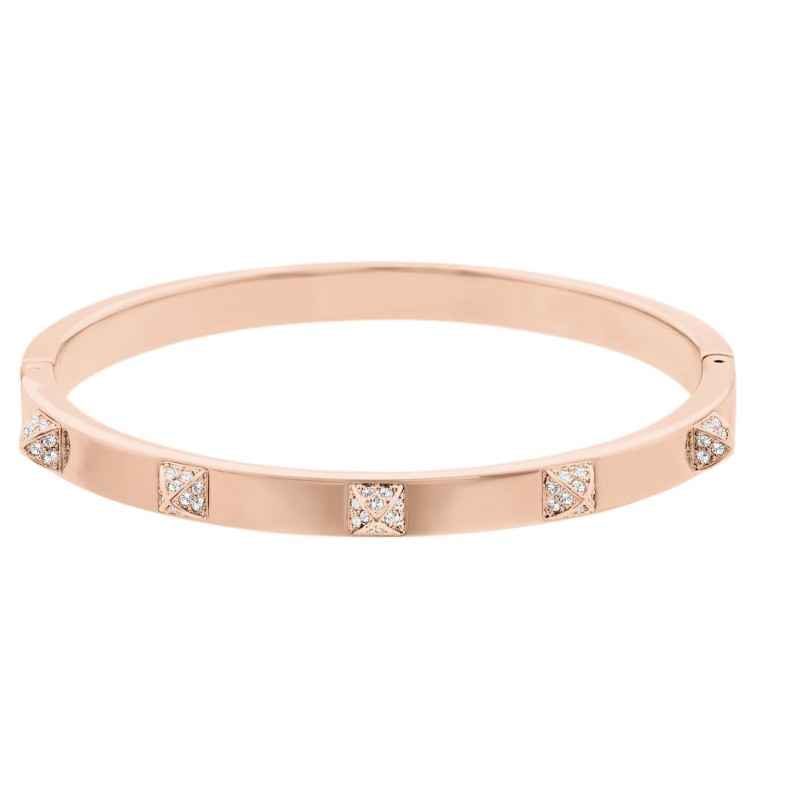 Ideale per le appassionate di moda! Il bracciale rigido in PVD oro rosa interpreta gli attualissimi trend di bracciali rigidi sottili e borchie. Il profilo minimalista e contemporaneo ne fa la scelta ideale da indossare con altri bracciali morbidi o rigidi, per creare uno stile sovrapposto decisamente à la page!