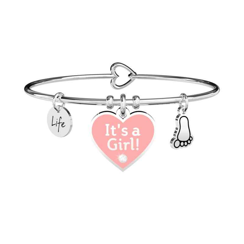 Bangle in acciaio con ciondoli a cuore smaltato rosa e a piedino.