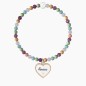 Bracciale elastico con pietre multicolor e ciondolo a forma di cuore in acciaio satinato con bordo rosé lucido, cristallo e scritta "Amica".