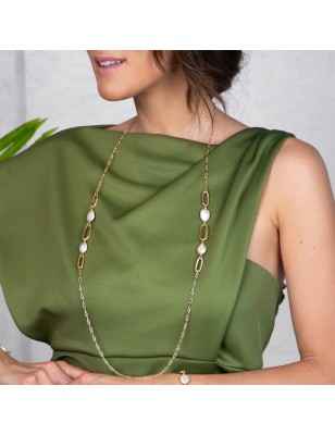 Elegante collana lunga Perle Chic, raffinata creazione in argento placcatura oro giallo con perle barocche e dettagli ovali spazzolati. La catena, impreziosita da elementi decorativi, crea un perfetto equilibrio tra stile...