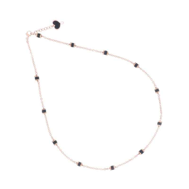 Girocollo realizzato in argento 925 con galvanica oro rosa ad alto spessore e resistenza catena e pietre di Agata nera tra dischetti di ematite.