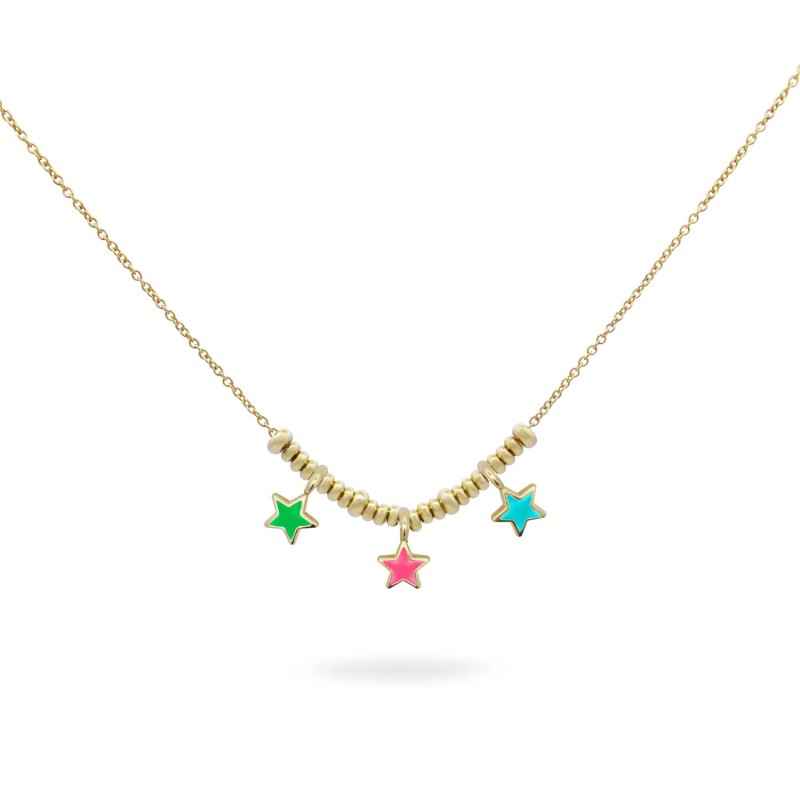 Girocollo catena micro anelli in argento galvanica oro giallo con tre stelline smaltate a mano. La stella, soggetto iconico di Rue des Mille, si colora di fucsia, verde, turchese.