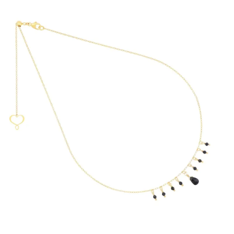 Girocollo realizzato in argento 925 con galvanica oro giallo; presenta una serie di pietre di spinello sfaccettato pendenti e una goccia di spinello pendente.