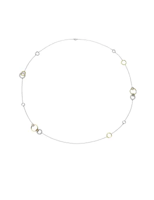 Abbraccia il fascino senza tempo di questa collana lunga in argento che combina cerchi intrecciati con finiture in platino e oro giallo, creando un design sofisticato e versatile che simboleggia l'eternità e l'unione. Realizzata con materiali ipoallergenici e senza nichel, è perfetta per essere indossata da sola o con altri gioielli per un look personalizzato.
