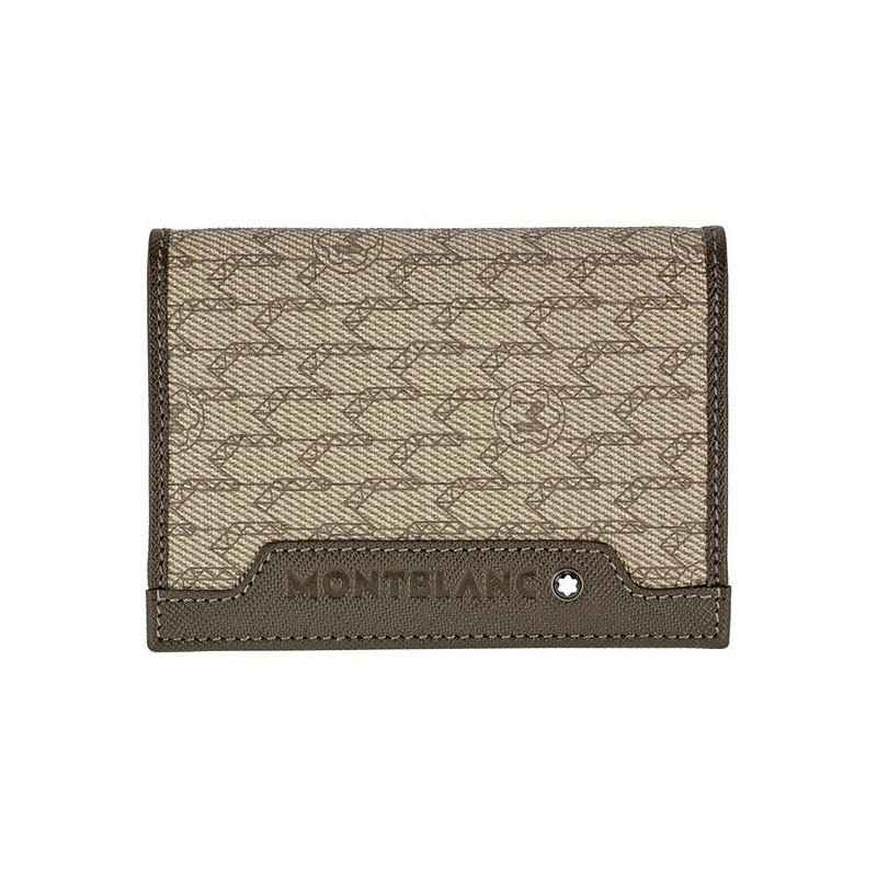 Porta biglietti da visita Montblanc in tessuto color pietra con dettagli in pelle marrone, design elegante e funzionale.